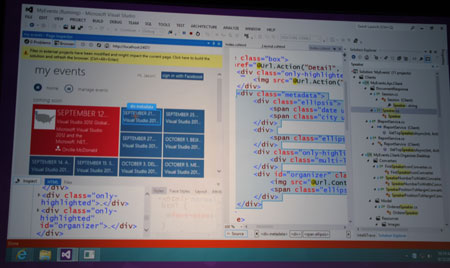 第一段演示是持续提醒和通知服务的演示。利用Ajax进行Web+社交,并可以自动辨认当前用的是哪个版本的HTML,以进行语法的侦测。现场演示的Visual Studio 2012 功能还包括:
