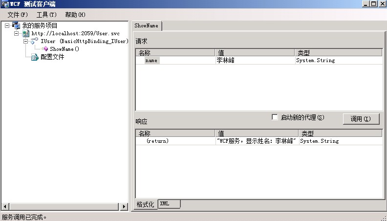 在请求窗口中的值中输入参数“你的姓名”,然后点击“调用”,在响应窗口中会 出现返回值“WCF服务,