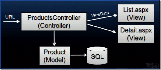 一个URL请求, ASP.NET MVC引擎会分析这个URL要使用那个Controller, 这个Controller(实际上真正的方法是Controller的Action)从数据库或者其他数据源获取数据,通常这些数据是一个业务的模型类(即MVC中的Model). Controller将Model对象传递给页面(即MVC中的View), 页面显示在浏览器上.(这一步是ViewEngine的功能, 我们一般的ASPX页面使用的是WebForm的ViewEngine,当然也可以替换.)