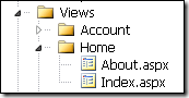 这里面存放的都是View对象, 也就是只有显示功能的aspx页面文件.但是aspx文件要遵循约定: Views下面要按照Controller创建文件夹, 比如HomeController就对应Home文件夹, 然后在里面添加view, 比如index.aspx, 那么在HomeController中返回到名为Index的View对象实际就会返回Views/Home/Index.aspx页面.