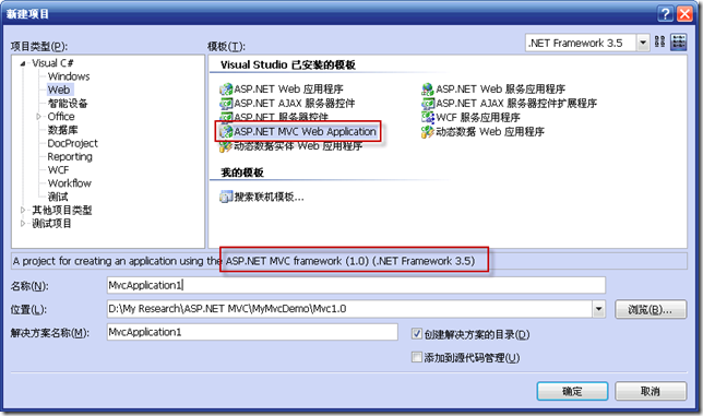 在官网上下载ASP.NET MVC安装文件, 一路回车完成安装. 启动VS2008 SP1(不是VS2008?不是SP1?作为一个专业的IT人士,水平可以菜,软件咱一定要用新的!去找个新版本吧!),点击新建,在Web中可以找到:
